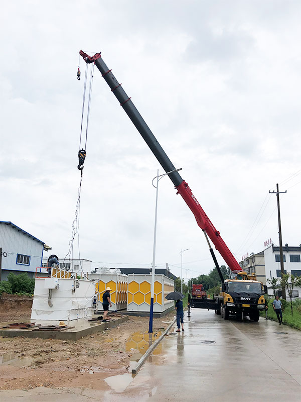 6、在小區(qū)污水處理設(shè)備內(nèi)注入清水,檢查各管道有無滲漏,若無則箱體四周覆土,直至設(shè)備檢查孔,并平整地面。